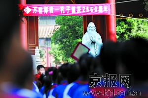 “拜,興,禮成!”今天是孔子誕辰2560周年紀念日,上午,孔廟舉行了傳統(tǒng)的拜師禮活動。國子監(jiān)中學初一年級的160名學生在孔廟大成門舉行了拜師禮。
