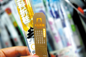 “這款狀元筆買的人很多,大家都希望能高中狀元,上次一個(gè)家長就買了10支”。昨天下午,省城長江路上一家文具店內(nèi)店家向顧客介紹。記者抽取了一款外包裝印有“登科折桂”字樣的中性筆筆芯,打開后里面竟然還附帶一張小卡片,卡片上寫有“上上簽”、“天壇祈!钡却蠹罄恼Z句(如圖)。店家王女士告訴記者,這種“討彩”文具是今年才大量出現(xiàn)的,賣得非常好,有的學(xué)生和家長還專門前來購買!捌鋵(shí)大家也都是種心理暗示,圖個(gè)吉利,商家正好抓住了消費(fèi)者的心理”王女士說。