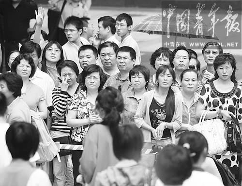 考試結束后,家長們紛紛探身張望著尋找自己孩子的身影。有家長從口袋取出塑料碗封好的點心,停在路邊的私家車也都發(fā)動起來,開著空調迎接。執(zhí)勤警察不斷地提醒家長后退,給考生讓路。瞬間,在校門口形成了兩排“夾道歡迎”的人群,“這里變成星光大道了,我們都是追星族!”一位家長調侃道,“真是可憐天下父母心啊”。