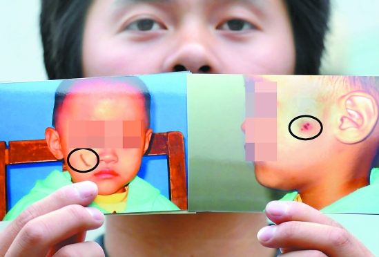 可10月20日發(fā)生的一件事,徹底激怒了小徐夫婦。那天,小徐去接女兒回家,發(fā)現(xiàn)女兒臉上竟然有三個(gè)血痕,一看就知道是小孩的牙印!拔耶(dāng)時(shí)真是氣不打一處來,孩子送到托兒所本來是買個(gè)放心,可現(xiàn)在卻弄成了這樣!