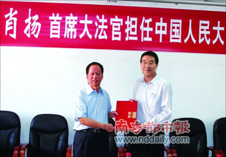 今年71歲的肖揚,廣東河源人,1957年至1962年曾在人大法律系學習,畢業(yè)后長期在廣東工作,后歷任司法部部長、最高人民法院院長,是十五、十六屆中央委員。