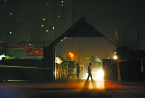 昨天深夜11時許,記者在望京東湖灣小區(qū)東門看到,這里的在建工地燈火通明,響聲一片,距離已經(jīng)入住的居民樓不過百米遠。記者隨即繞行到小區(qū)南門發(fā)現(xiàn),一輛掛著“甘”字車牌的水泥攪拌罐車順著坑洼不平的馬路,駛離了工地。此時,工地大門大敞著,工地內(nèi)另一輛水泥攪拌罐車打著雙閃待命,工地中機械轟鳴聲不絕于耳,還不時地傳出施工車輛“嘀、嘀、嘀”的倒車聲,直至今晨零時記者離開現(xiàn)場時,夜間施工仍未停止。
