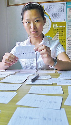 北方人難聽(tīng)懂南方話(huà),更難學(xué)重慶的地方土話(huà)!在萬(wàn)州區(qū)龍沙鎮(zhèn)龍安村任村委黨支部書(shū)記助理的遼寧籍大學(xué)畢業(yè)生李飛就是其中一個(gè),她是去年考上我市的“村官”。在9個(gè)月的“村官”生活中,她因不懂當(dāng)?shù)赝猎?huà)鬧過(guò)笑話(huà),遭過(guò)白眼。因此,她不停地觀(guān)看帶有重慶方言和土話(huà)的電視劇進(jìn)行模仿,寫(xiě)了230頁(yè)土話(huà)“名片”隨身帶,天天念。