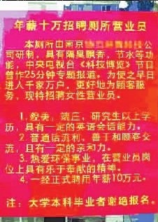 這條招聘啟事上商家自稱中央電視臺(tái)“科技博覽”曾經(jīng)作25分鐘專題報(bào)道。要招端莊,貌美,研究生以上學(xué)歷,具備—定英文會(huì)話能力,年薪10萬,謝絕大學(xué)本科學(xué)歷者報(bào)名。
