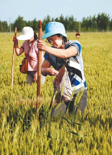 5月23日,河南省安陽市湯陰縣花耳莊村大學生“村官”張文紅(前)在即將收割的麥田幫助困難農(nóng)戶套種玉米。