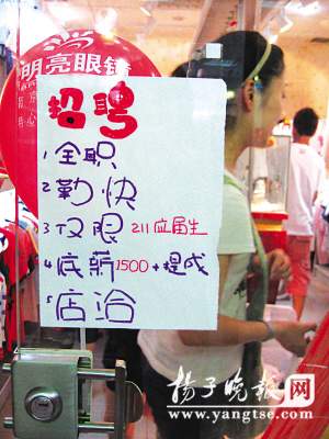 “招聘:全職,勤快,僅限211應(yīng)屆生,底薪1500+提成,店洽”。這家名為“彩虹糖”的外貿(mào)服飾店門(mén)口貼出的招聘啟事20字左右卻沖擊力十足,其中“僅限211應(yīng)屆生”部分還用紅色筆著重標(biāo)出。