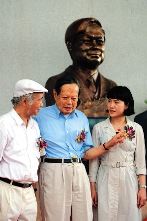 楊振寧1993年成為東莞理工學(xué)院名譽(yù)院長,東莞理工學(xué)院請雕塑大師潘鶴為他新建了一座“楊振寧銅像”,安放在學(xué)校圖書館的門口。楊振寧此行就是出席銅像揭幕儀式的。