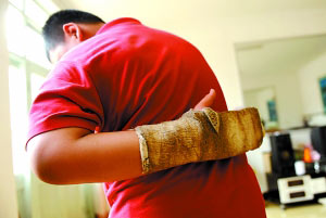 第二次受傷在5月21日。曹力強(qiáng)說,“那節(jié)是社會(huì)課,我在課上問了同學(xué)一個(gè)問題,教社會(huì)課的張老師朝我走過來,我當(dāng)時(shí)害怕,就從座位上起身,往教室后面躲,到教室最后面,我拿掃帚擋著身體,張老師抓住我的左胳膊往后別,還掰我手指!