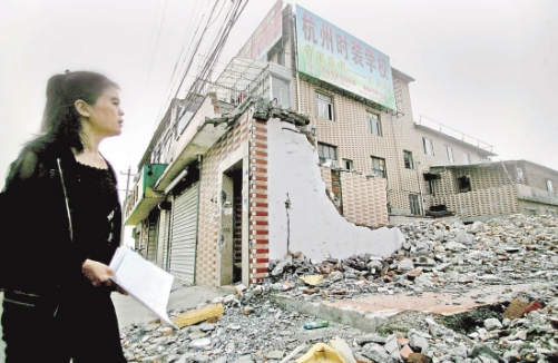 杭州彭埠鎮(zhèn)備塘路西邊是一大片廢墟,因為火車東站樞紐工程建設,這里大片房子都拆走了。廢墟中,卻有一幢四層樓孤零零地站著。很少有人知道,這是一所時裝學校,學校里至今還有100多人在上課。由于四周房子都拆走了,學校樓房墻壁上出現(xiàn)了裂縫,樓面也有些傾斜,玻璃窗也壞了。為什么學校遲遲不搬?接到讀者報料后,記者來到現(xiàn)場。