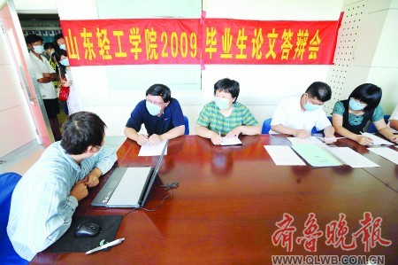 24日上午9點(diǎn)45分,一條標(biāo)有“山東輕工學(xué)院2009畢業(yè)生論文答辯會(huì)”的紅色橫幅掛在山大二院血液科會(huì)議室里,山輕工食品與生物工程學(xué)院的五位老師戴著藍(lán)色口罩一字排開(kāi),坐在一張長(zhǎng)條桌的一側(cè)。張萍穿著住院服,戴著口罩在同學(xué)彭愛(ài)琴的攙扶下來(lái)到會(huì)議室。