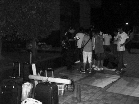 當(dāng)時,大部分學(xué)生帶來的錢已經(jīng)用完了。有的一整天沒吃飯,有的連回家的路費也不夠了。晚上10點半, 20多個學(xué)生蜷在中信國際大酒店停車場的綠化帶邊,打起了地鋪,身邊堆滿了大大小小的行李。14名女生和9名男生(除9人外,還有4名男生滯留其他地方)流落街頭。
