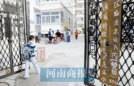 9月15日上午7時(shí)許,鄭州市伊河路與桐柏路交叉口附近的長(zhǎng)宏花園小區(qū)門口多了個(gè)牌子:因有特殊原因,不是本小區(qū)業(yè)主不讓入內(nèi)(幼兒園)。落款為長(zhǎng)宏業(yè)主。同時(shí),小區(qū)業(yè)主也當(dāng)起“門神”,守著小區(qū)大門,不讓學(xué)生進(jìn)入小區(qū)內(nèi)長(zhǎng)宏幼兒園上課。