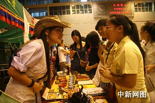 在藏族展臺(tái)邊,記者看到,身著藏族服裝的兩位藏族男生將藏飾、藏族食品以及青稞酒擺了滿滿一桌。兩位藏族學(xué)生一邊向大家介紹從家鄉(xiāng)特別帶回的奶酪、炒青稞以及藏豆等食物,一邊忙著以內(nèi)地少見的酥油茶招呼同學(xué)。有瓜果之鄉(xiāng)的新疆維吾爾族展臺(tái)更是琳瑯滿目。身著鮮艷的維族服裝的少女亦忙著向漢族同學(xué)介紹美麗的家鄉(xiāng)。