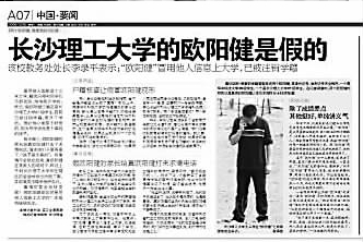 在長沙理工大學讀大三的“歐陽健”,在接受湖南媒體采訪時,也稱自己的成績和身份不假。26日,湖南某報推出跟蹤報道《長沙理工大學的歐陽健是假的》。報道稱,長沙理工大學教務(wù)處表示那里的“歐陽健”,冒用他人信息上大學,已被取消學籍。