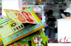 記者了解到,孩子們購(gòu)買的“地下彩票”(見(jiàn)上圖,記者于濤攝)全都是5角一張。有的上面印著人民幣圖案,刮開(kāi)后是什么面值的鈔票就能得到多少錢,有的就只能換到小玩具。眼看到了上學(xué)時(shí)間,孩子們還在不停地刮獎(jiǎng)。