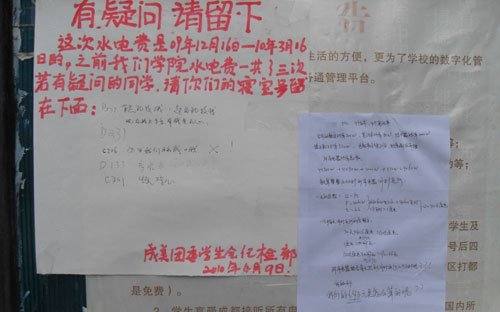 隨后,該校后勤部工作人員張貼了一份通知向?qū)W生解釋。通知寫道:“該表為學(xué)生公寓2009年9月~2010年3月學(xué)生公寓應(yīng)交水電費;實際計量水、電月份分別為2009年10月、11月、12月,2010年1月、3月(1月10日~2月28日寒假)。”