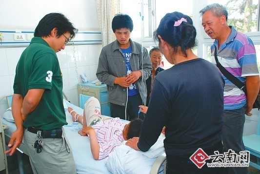 事情過去快一周了,但躺在玉溪市人民醫(yī)院病床上的斌斌(化名)和席席(化名)臉上還有明顯的燒傷痕跡。斌斌的傷情是在所有傷者中最嚴(yán)重的,被火燒到臉部和手部以后,他還去水龍頭下洗了頭,結(jié)果把臉上和手上的一大塊皮都抹了下來。