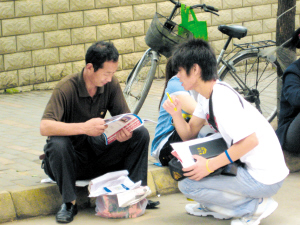 6月7日,高考的第一天。早上7點(diǎn),當(dāng)記者來到蚌埠市懷遠(yuǎn)縣一中大門口時(shí),發(fā)現(xiàn)這里除了正在等候考試的考生和家長(zhǎng),還有很多手里拿著大堆傳單和招生簡(jiǎn)章的年輕人,并不斷地往家長(zhǎng)和學(xué)生手里塞。