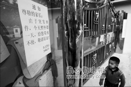 在公開信的邊上還貼著一份機(jī)關(guān)四幼的通知,稱“由于突發(fā)事件,今天暫停課一天”。在這份通知的左下角,有人用圓珠筆歪歪扭扭地寫下了不滿:“家長要求退還所有費(fèi)用,到其他學(xué)校上學(xué)。”