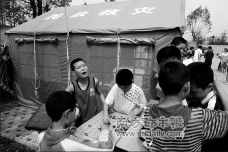 19日10時(shí)30分:谷勝聰坐在初一教學(xué)部的電腦前,15平方米大的帳篷里坐著近10名老師。檢查過記者的證件后,谷勝聰拿出一包潤(rùn)喉糖,拿出一顆后又塞進(jìn)包里。