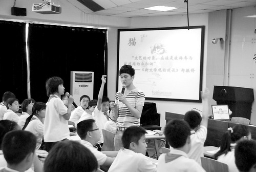 杭州建蘭中學的李明老師在語文課上與學生一起討論新文學觀。(資料照片)