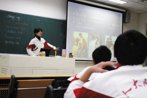 據(jù)了解,人大附中高中部開(kāi)設(shè)的“主題電影欣賞”選修課,從組織到授課,都是由5名高中生全程承擔(dān)。這些熱愛(ài)電影、能力突出的高中生從暑假起便精心制訂教學(xué)計(jì)劃、寫教案、剪輯影片、做PPT。五名高中生的創(chuàng)舉贏得了選課同學(xué)的好奇和贊許。圖為一名學(xué)生在用幻燈講授電影欣賞知識(shí)。記者 羅德宏 實(shí)習(xí)生 王靜怡/文