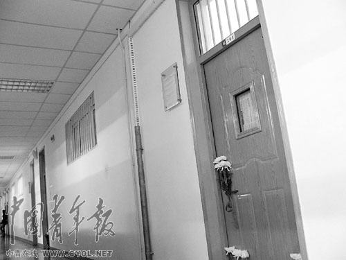 照片:教室門口擺放著吊唁的白色鮮花。 本報(bào)記者 王國(guó)強(qiáng)攝