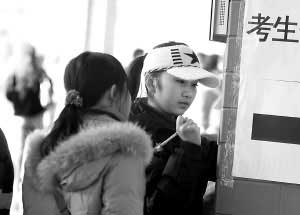 盡管天氣寒冷,但大多數(shù)女生還是穿著超短裙。而偶像組合的“卷卷頭”造型、韓劇里圍巾的百變戴法等也出現(xiàn)在考生的著裝中。