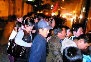 昨晚7時(shí)許,解放軍307醫(yī)院門口,數(shù)十名家長和孩子相互配對,排成四列,正在等候大巴車。
