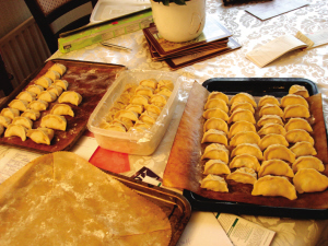 那天我們買來了大包小包很多原料:面粉、玉米、芹菜、豬肉、香菇,房東的廚房成了我們的“餃子鋪”。