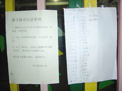 記者趕到現(xiàn)場時,看到幼兒園門前排起了上百人的隊伍,大部分人都帶著小板凳,有的甚至帶來了帳篷支在學(xué)校門口,看樣子要打持久戰(zhàn)。記者奇怪,現(xiàn)在才2月份,小孩要到9月份才能入園,有必要現(xiàn)在就排隊嗎?還冒雨。正在排隊的蘇先生告訴記者,明月港灣雙語電腦幼兒園貼出了告示,通知小區(qū)居民于2月9日早上8點到幼兒園登記報名,先到先得(號)。當天中午,他咨詢了幼兒園,一位老師告訴他,去年幼兒園招小朋友,也是家長排隊的。如果排在后面,超過了幼兒園收生的限制,那就上不了了。蘇先生的兒子到9月份滿三周歲,就要上幼兒園了。同時蘇先生了解到,幼兒園小班是25人,但登記的人數(shù)已經(jīng)達到近50人了。蘇先生緊張起來,立刻加入到隊伍中,再朝前面一看,他排在第24位。接著就陸陸續(xù)續(xù)的有家長來排隊,到晚上8點多,隊伍已經(jīng)有上百人了。