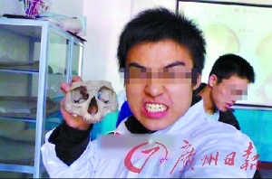 此外,根據(jù)網(wǎng)友提供的帖子圖片,網(wǎng)友稱事實(shí)上還有一些“玩尸男”,一些男生穿著白大褂,白大褂上印著“北醫(yī)學(xué)院”字樣,在一間標(biāo)本室內(nèi)拿著人體頭骨擺弄造型,而且還有老師模樣的人在場。