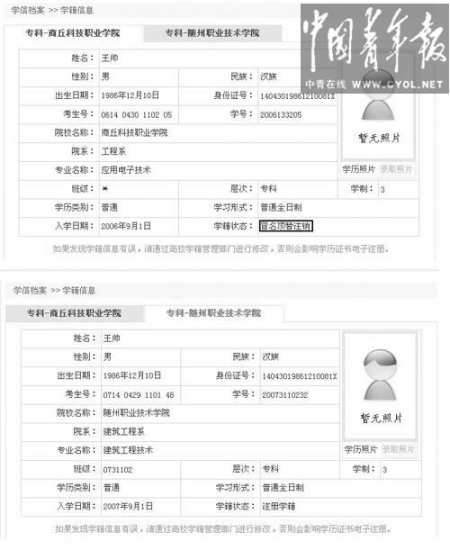從學(xué)籍科老師處知道自己的身份可能被盜用的消息后,王帥登錄中國高等教育學(xué)生信息網(wǎng)查詢。他發(fā)現(xiàn)自己的身份下有兩個學(xué)籍信息,一個是自己2007年入學(xué)的隨州職業(yè)技術(shù)學(xué)院,另一個則顯示為:2006年9月1日入學(xué)商丘科技職業(yè)學(xué)院工程系應(yīng)用電子技術(shù)專業(yè),學(xué)制三年?,學(xué)籍狀態(tài)為已畢業(yè)。后者的姓名、出生日期、身份證等信息均與自己相同,考生號則為自己第一年參加高考的準考證號。兩個學(xué)籍信息均沒有照片。