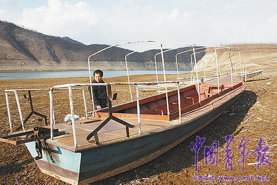 而這段時間,正值春季的枯水期,水位要從半山腰回落30多米,大多數(shù)地方的江底都裸露出來,隨處可見干枯的水草和龜裂的泥灘,那艘鐵皮船也趴在一處岸邊,動彈不得。