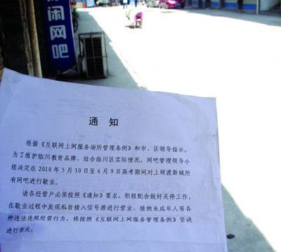 5月30日,有網(wǎng)友在天涯社區(qū)發(fā)帖稱,5月25日山西臨縣網(wǎng)吧協(xié)會(huì)貼出了網(wǎng)吧關(guān)閉的公告:“有關(guān)部門要求網(wǎng)吧停業(yè),具體何時(shí)開放另行通知!痹摼W(wǎng)友稱據(jù)傳是因?yàn)榧磳⒌絹?lái)的高考而強(qiáng)制關(guān)閉了該縣城所有網(wǎng)吧,“全縣所有的網(wǎng)吧都在劫難逃,光纜被停,只能用電話線上網(wǎng)。”