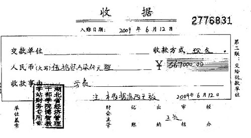 6月15日,學(xué);I集了45萬(wàn)元現(xiàn)金,匯給了楊某的指定賬戶。令人意外的是,這個(gè)賬戶并不是學(xué)校的公共賬戶,而是一個(gè)名叫“王貞”的私人賬戶。等他們拿到收據(jù)后,上面蓋的公章是“湖北省經(jīng)濟(jì)管理干部學(xué)院博智教學(xué)站”。