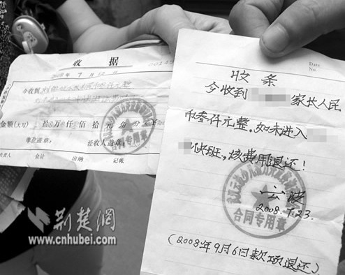 據(jù)學(xué)生家長易女士介紹,她家住漢口頭道街,小孩今年剛剛讀初一。一年前,孩子讀六年級的時候,她在家附近的“武漢博淵培優(yōu)公司”給孩子補(bǔ)習(xí)數(shù)學(xué)。7月12日,小孩回家后告訴她說,培優(yōu)老師稱他在附近的中學(xué)有關(guān)系,可以介紹學(xué)生進(jìn)快班,不過要收取3000元錢。于是,易女士交給了培優(yōu)老師3000元錢,并拿到了一張收條。收錢方承諾,進(jìn)不了快班就退錢,落款名為“云波”。