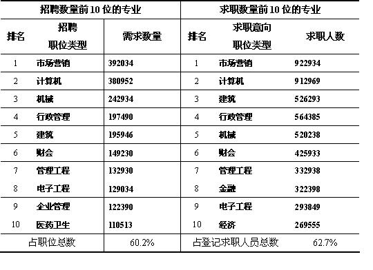 計算機、市場營銷、機械、行政管理、建筑等專業(yè)是人才市場招聘的熱點,求職人員主要集中在這五個專業(yè)。