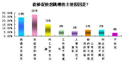 調(diào)查中也發(fā)現(xiàn)令職場(chǎng)人士下定決心跳槽的幾大因素。受訪人士中16%的人士選擇“有較高的收入或是職位”,13%的人士選擇“更好的學(xué)習(xí)機(jī)會(huì)和積累過(guò)程”,其次包括公司規(guī)模、是否工作繁忙等等都成為選擇重要依據(jù)。這和另一項(xiàng)調(diào)查“什么情況下會(huì)拒絕Offer”基本相對(duì)應(yīng)。職位和薪水和心理預(yù)期落差太大成為拒絕Offer的主要因素。
