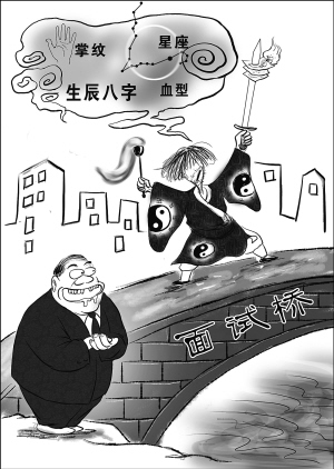 找工作面試,要先經(jīng)“相面先生”看面相看掌紋;能否錄用,要由血型說(shuō)了算;是否適合職位,得計(jì)算一下星座和生辰八字再說(shuō)。過(guò)了“金九銀十”的網(wǎng)上申請(qǐng)、網(wǎng)上投簡(jiǎn)歷高峰,11月起應(yīng)聘面試進(jìn)入高峰期,不少求職者在面試中屢屢遇到新招怪招,讓人“看不懂”。