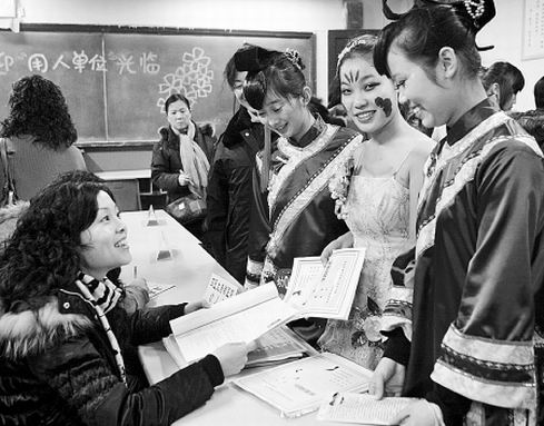 “今年學(xué)生們的總體期望值下降了,以前像寧夏、新疆這些地方要招人,根本沒人愿意去,特別是成績優(yōu)秀的學(xué)生,工資少于4000根本不考慮,但今年,很多學(xué)生自己降低了要求。”在陜西師范大學(xué)就業(yè)指導(dǎo)中心辦公室采訪時(shí),記者遇到了該校外國語學(xué)院老師。