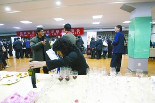 幾名學(xué)生拿著紅酒走到翰威特咨詢(xún)公司大中華區(qū)人力資源總監(jiān)朱纓面前,碰杯后,向她咨詢(xún)?cè)趺磳?xiě)求職簡(jiǎn)歷。昨晚(12月11日),在北京大學(xué)第一體育館地下室,一場(chǎng)“求職交流酒會(huì)”吸引了8家企業(yè)和200多名同學(xué)參與。