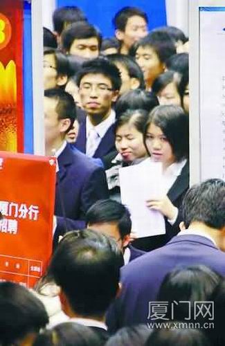 當(dāng)日在廈大召開的畢業(yè)生招聘會,是廈大每年為自己的畢業(yè)生舉辦的,不過,幾乎省內(nèi)的大學(xué)都有人趕去參加,使得廈大這一年一度的招聘會首次實(shí)行門禁——依照人流量分時(shí)段放人入場,有的畢業(yè)生花了一小時(shí)才遞上一份簡歷。