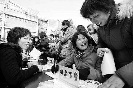 昨天始,縣總工會領導分三路,會同當?shù)亍疤枍u”建筑陶土板公司、“多蒙佳樂”服飾公司、“裕達”鞋業(yè)公司、博勝制衣廠等20余家企業(yè)的人力資源部經(jīng)理、工會干部,帶著1070個崗位用工信息,走進外來農(nóng)民工集中居住點、當?shù)夭糠掷щy群眾家庭、以及勞動力交流市場,將“上崗信息”直接送到外來農(nóng)民工、當?shù)叵聧徛毠な种。來長興找工作的江西籍民工何源、贛州市的謝文君,此前擔心找不到工作,在往集中居住點尋親戚過程中,遇到了幾家企業(yè)來送“崗位”,他倆立刻選擇了“多蒙佳樂”公司縫紉工崗位。