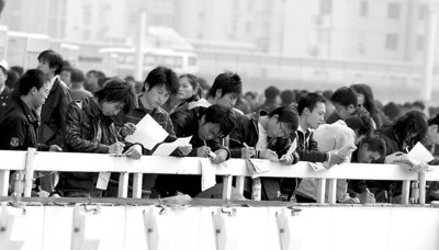 去年9月,本市某大型人才機(jī)構(gòu)對(duì)500多家單位進(jìn)行調(diào)查統(tǒng)計(jì),退休和空缺崗位大約有2000多個(gè),隨后,去年11月就舉行了一場(chǎng)招聘會(huì),一天時(shí)間內(nèi)吸引了一萬多名求職者投遞簡(jiǎn)歷。今年元旦后,一些單位分別對(duì)求職者進(jìn)行測(cè)試、面談,通過測(cè)試、考核的求職者已經(jīng)來單位開始實(shí)習(xí)、試用。然而,剛剛過去3個(gè)月,這家大型人才機(jī)構(gòu)又舉行第二場(chǎng)招聘會(huì),參加招聘企業(yè)仍是三個(gè)月前參加的500家企業(yè),提供崗位仍是2000多個(gè)。