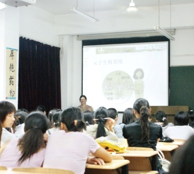 昨晚7點(diǎn),在該校一間可容納90人的大教室里已坐滿了女生,有的正認(rèn)真做著筆記,有的與同伴小聲交談著。講臺上,女教師在介紹該課的主要內(nèi)容,包括女子生殖系統(tǒng)、避孕、婦科病等知識。