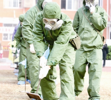 16:15 10名學(xué)生穿著防化服,拿著各種儀器小心謹(jǐn)慎地穿越染毒區(qū)并用白、黃、藍(lán)三中顏色標(biāo)明沾染區(qū)和非沾染區(qū),以便人們安全通過。接著,有8名學(xué)生安全通過了沾染區(qū)。