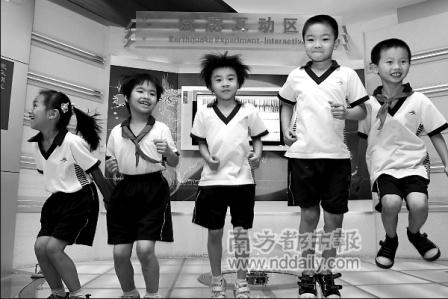 省地震科普館“試震互動(dòng)區(qū)”內(nèi),孩子們跳起體驗(yàn)“震級(jí)”。記者姬東攝
