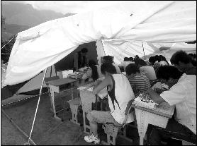 昨天下午,茂縣中學(xué)操場上架起了8個巨大的白色帳篷,帳篷上印有聯(lián)合國兒童基金會的藍(lán)色標(biāo)志。每頂帳篷里都坐滿了高三學(xué)生。為了散熱,帳篷兩側(cè)都被撩起來通風(fēng)。4點(diǎn)剛過,喧鬧的帳篷內(nèi)頓時安靜下來,其中一個帳篷里不久后傳出了一片讀書聲。旁邊的“教室”內(nèi)學(xué)生們安靜地做著卷子。記者悄聲問坐在帳篷邊的一位女生上什么課,她悄聲回答:“地理!