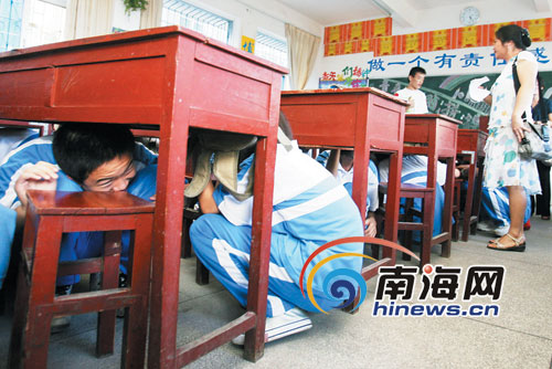11日下午,海口市地震設(shè)防中心副主任、全國(guó)十佳少先隊(duì)志愿者輔導(dǎo)員何照全向海口一中初中部的老師們進(jìn)行抗震培訓(xùn),在記者及海南廣播電視臺(tái)音樂(lè)廣播節(jié)目部副主任衛(wèi)華的建議下,何照全隨機(jī)指導(dǎo)初一某班學(xué)生進(jìn)行防震演習(xí)。他先向?qū)W生們講解了防震的基本常識(shí):如果在學(xué)校教室上課,從顛簸與搖晃中斷定是地震,老師應(yīng)立即命令大家不要慌,迅速蹲下來(lái)躲在桌子下,最好再拿書(shū)包護(hù)著頭部。待地震停止時(shí),老師立刻組織學(xué)生們有秩序地撤離,到操場(chǎng)上集合。